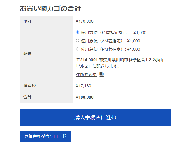 カートの「購入手続きに進む」ボタンの下にある、「見積書をダウンロード」ボタンを押すことで、PDF形式での見積書が入手可能です。